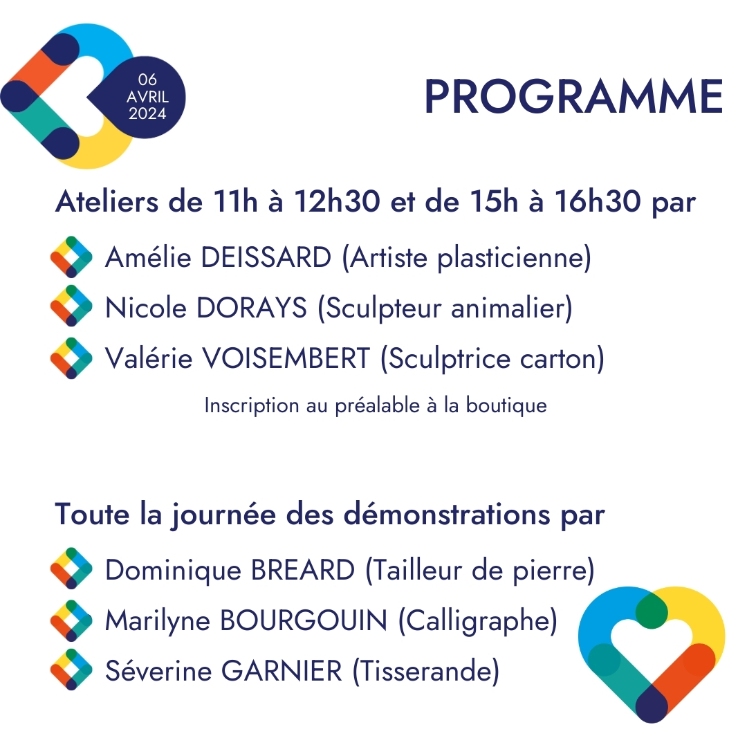 Les sessions d’ateliers sont ouvertes au grand public et se déroulent en deux créneaux horaires : le matin, de 11h à 12h30, et l’après-midi, de 15h à 16h30. Les animatrices Amélie DEISSARD, Nicole DORAYS et Valérie VOISEMBERT seront présentes. Nous encourageons les participants à s’inscrire préalablement à la boutique.